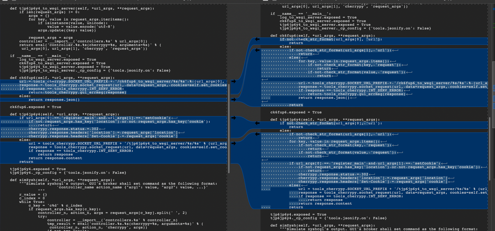 We can see the cherrypy exposed functions ck6fup6 and tjp6jp6y4 have now got new, exciting input validation. These seem to shit data off to some backend cherrypy functionality.