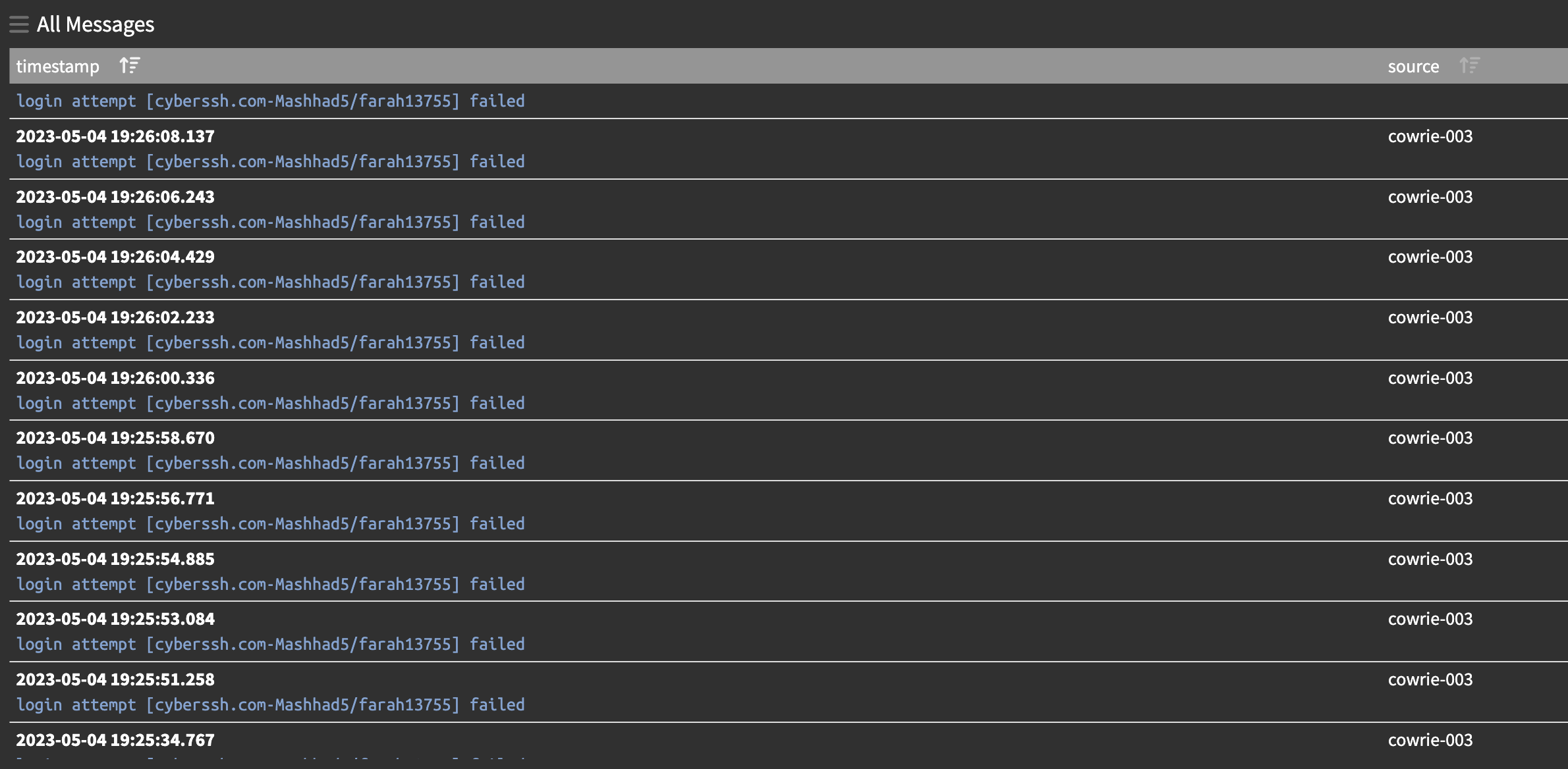 "2023-05-04T07:00:15.966Z","cowrie-003","login attempt [cyberssh.com-Mashhad5/farah13755] failed","46.51.81.115"A quick check of the top few guys there (the cyberssh and vpnudp ones) show me they are all trying to connect from Iran.
